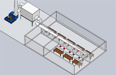 根據(jù)該公司提供的資料,本方案主要治理打磨車間在打磨時(shí)產(chǎn)生的木漆粉塵,該公司現(xiàn)有兩個(gè)打磨車間,兩個(gè)車間共8個(gè)工位,每個(gè)工位在一個(gè)2400*1200*750mm的臺(tái)面上打磨。打磨產(chǎn)生大量粉塵,危害車間工人身心健康,污染環(huán)境,為凈化治理該粉塵設(shè)計(jì)本方案。