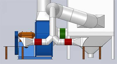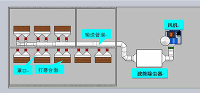 經(jīng)過(guò)實(shí)地考察,客戶打磨車間擺放大量待打磨工件,剩余空間較小,無(wú)法擺放與工件大小匹配的吸塵打磨臺(tái),且客戶偏向于集中處理,所有粉塵集中收集定期清理,為此我公司為客戶設(shè)計(jì)使用“罩口收集+濾筒式除塵器除塵”的方式進(jìn)行治理。